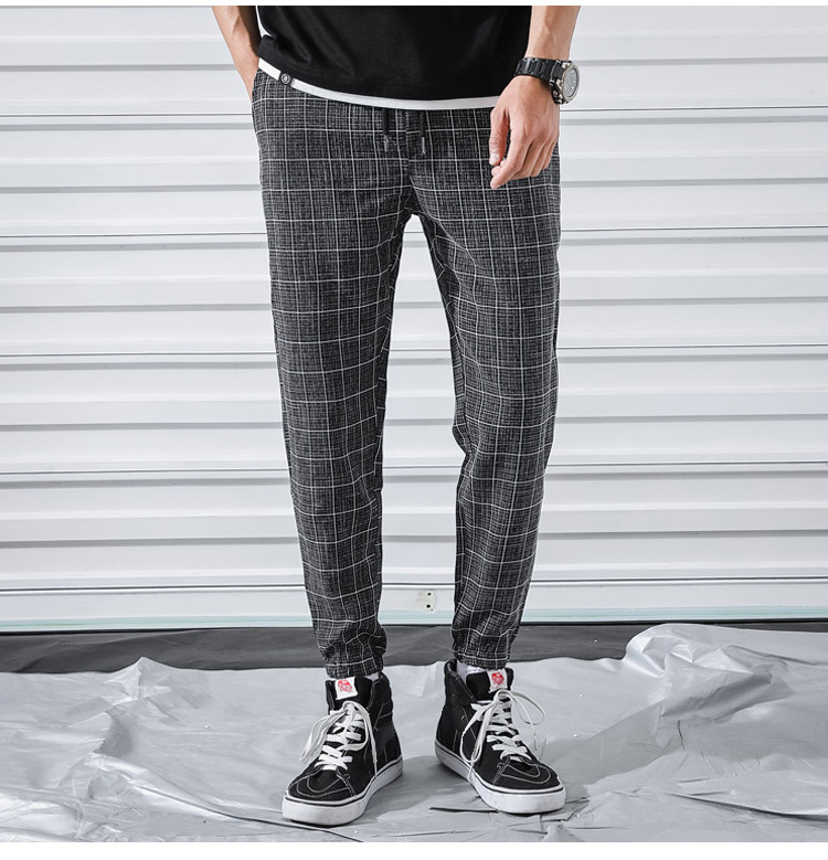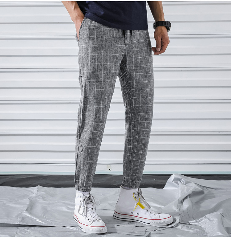 メンズチェック柄リネンテーパードパンツ